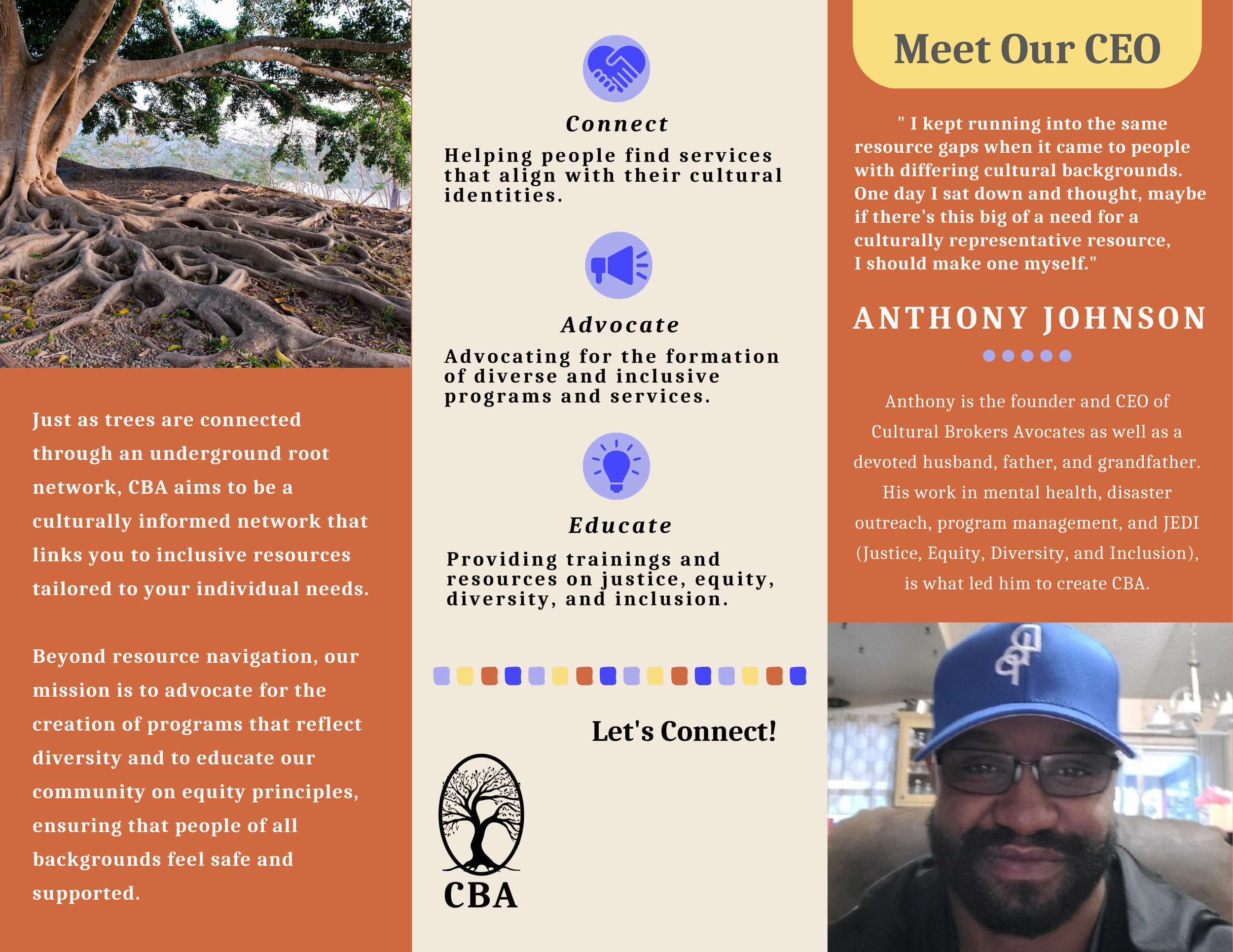 Cultural Brokers Advocates is a nonprofit organization based in Broomfield, Colorado. Founded by Anthony D. Johnson, the executive director, CBA was created to bridge the gap between marginalized communities and mental health resources. Anthony, a longtime colleague and friend, approached me with this vision, and together we built a brand identity and marketing strategy tailored to his organization’s needs.