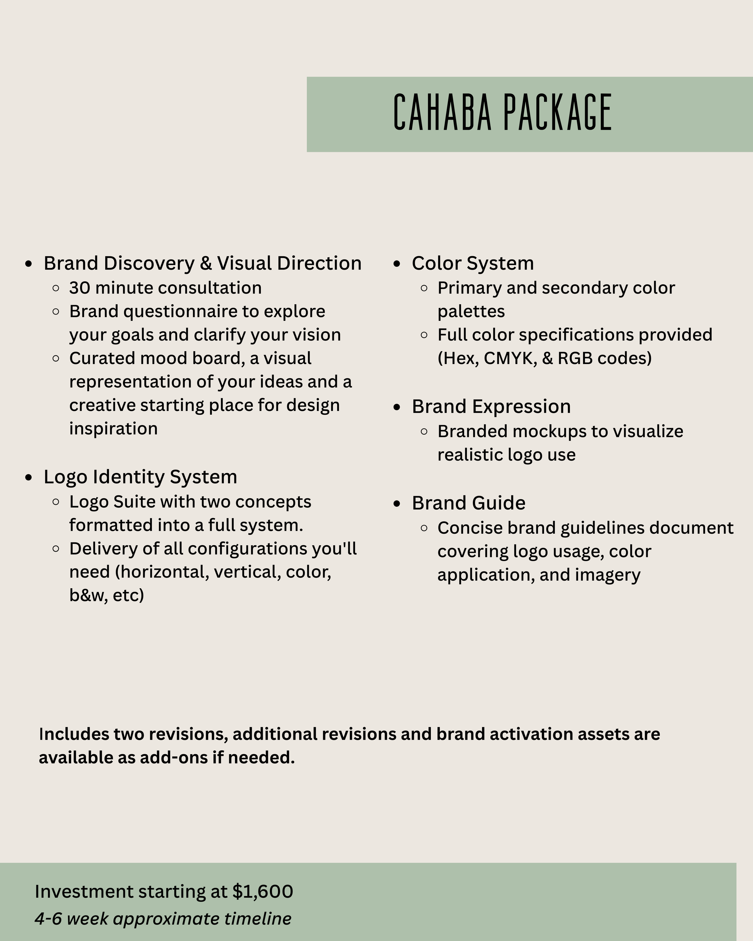 The Cahaba offers a visual identity system that aligns with your brand’s core vision. A logo suite, color palette, and branding guideline cover all your essential branding needs and create a strong foundation that your brand can grow from.